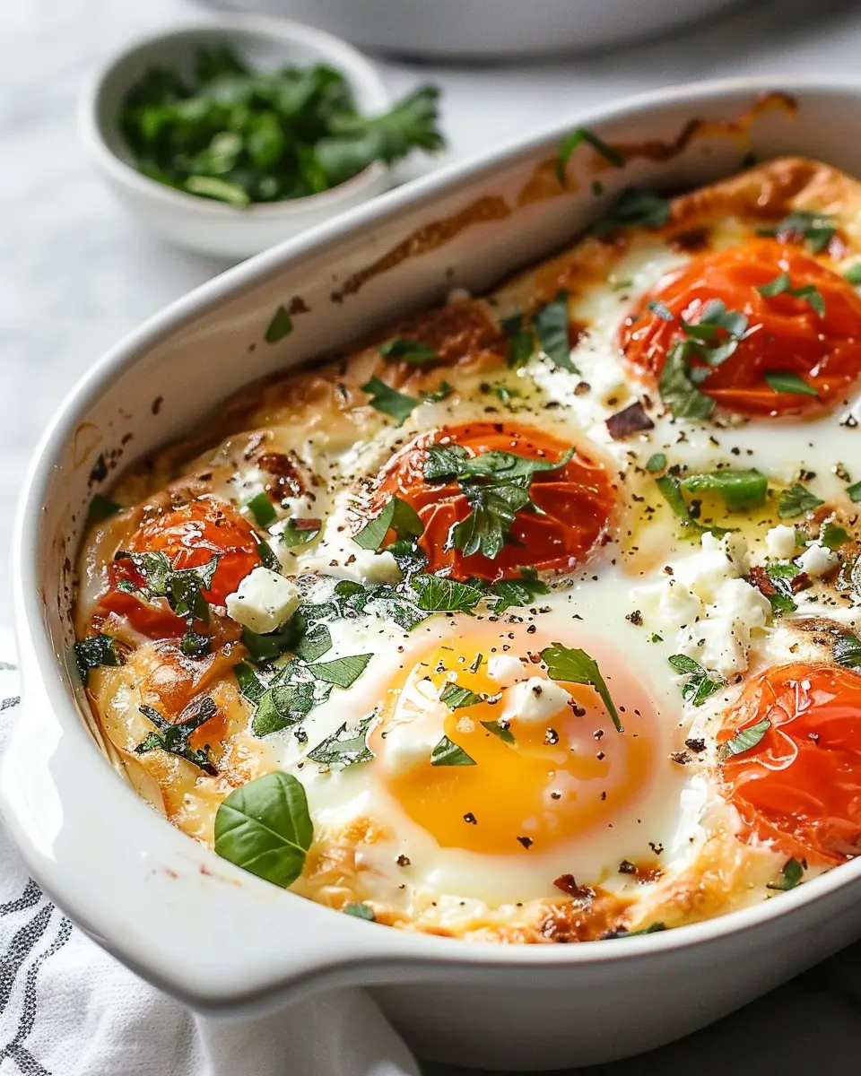 Absolutely! One of the great things about this baked feta eggs recipe is its flexibility. You can prepare the dish ahead of time by chopping your vegetables and crumbling the feta cheese the night before. On the day of serving, simply assemble the ingredients in a baking dish, whisk the eggs, and bake until everything is nice and bubbly. If you want to reheat leftovers, you can store them in the refrigerator and enjoy them warm the next day—just add a splash of water to the eggs to retain their moisture.