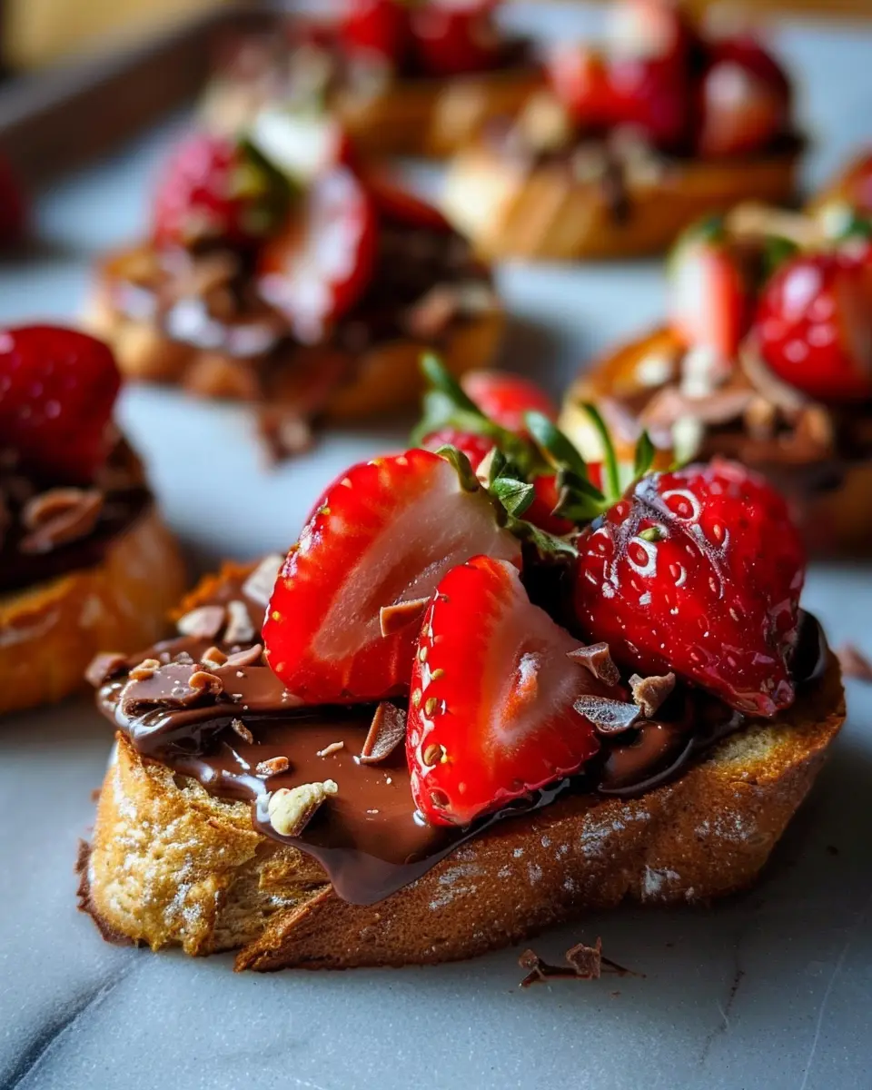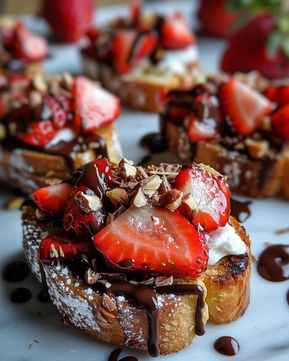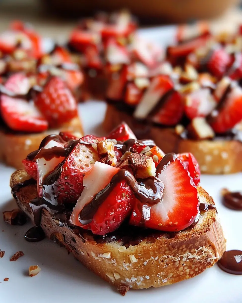 When you’re ready to wow your guests, Chocolate Strawberry Bruschetta can be a showstopper. Serve them on a rustic wooden board for a charming presentation. You could even mix up the toppings by adding a splash of orange zest or a sprinkle of nuts for extra texture. For a fun twist, get everyone involved! Set up a “bruschetta bar” where guests can create their own variations with toppings like whipped cream or mint leaves. This encourages creativity and makes it interactive!