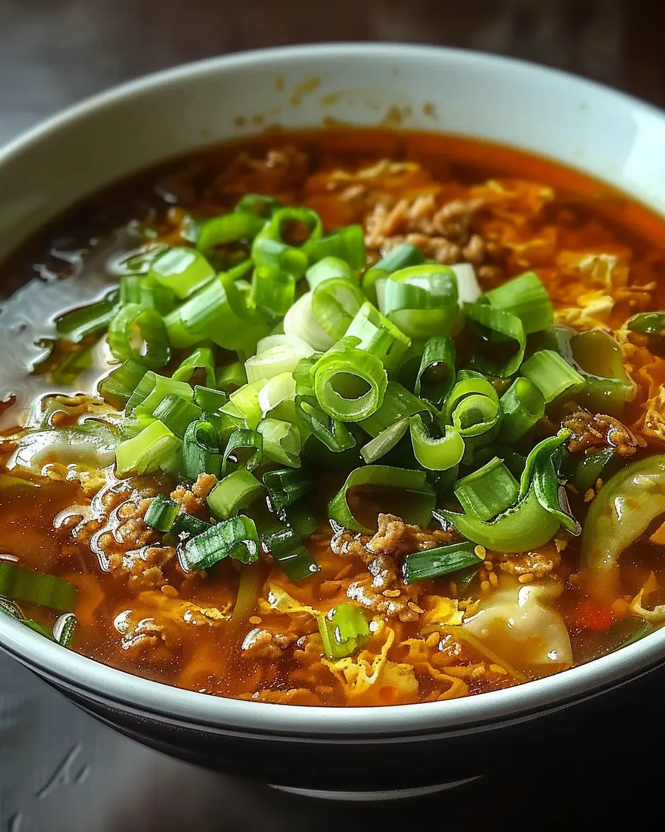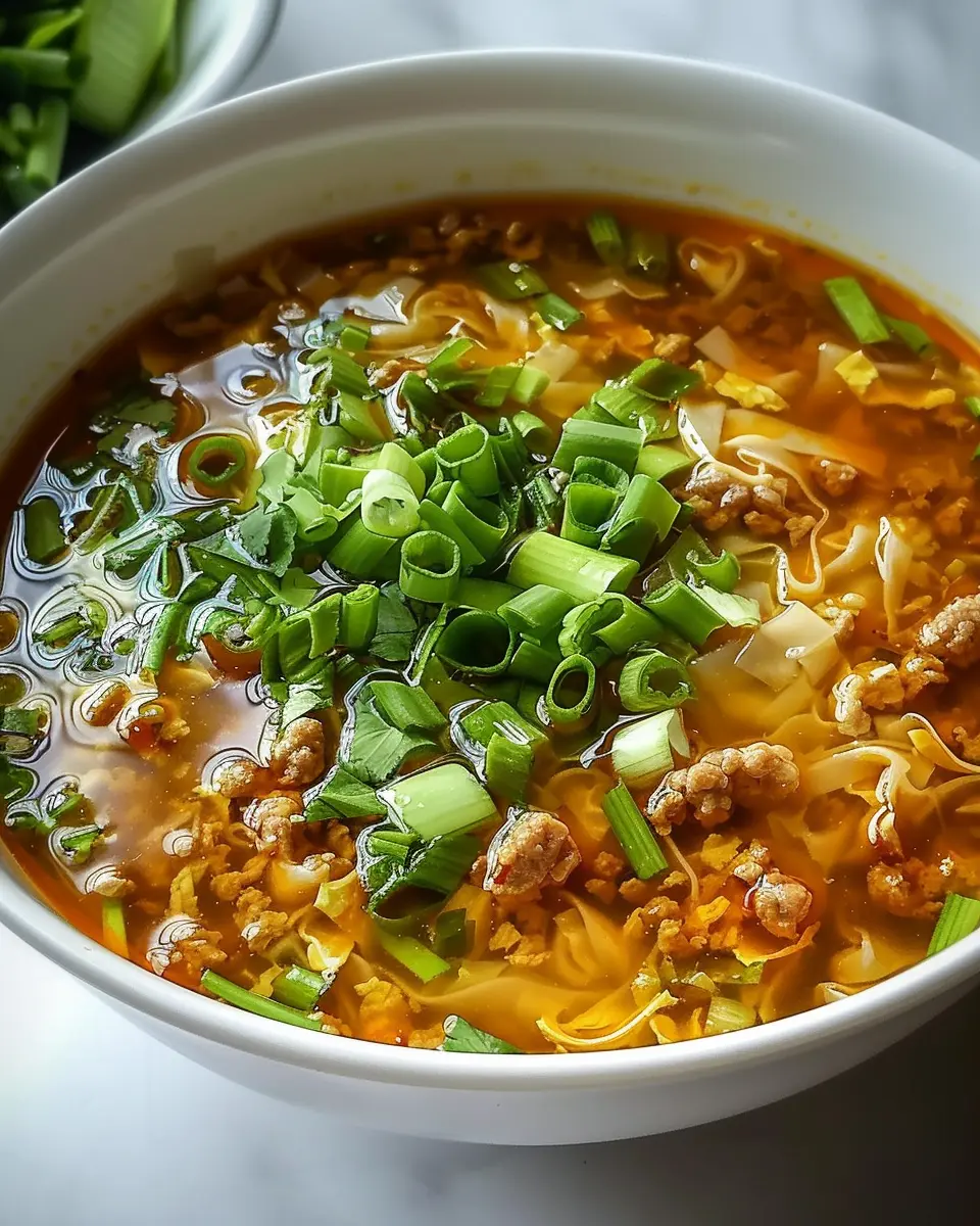 A warm and comforting egg roll soup featuring turkey bacon, green onions, and ginger, perfect for chilly nights.
