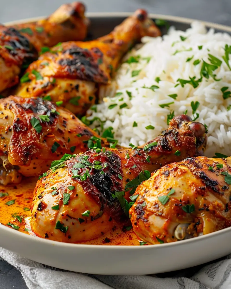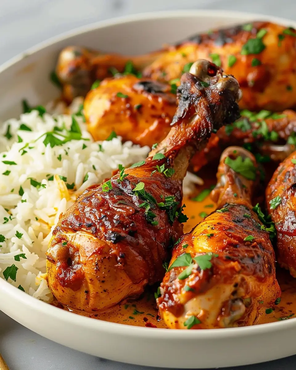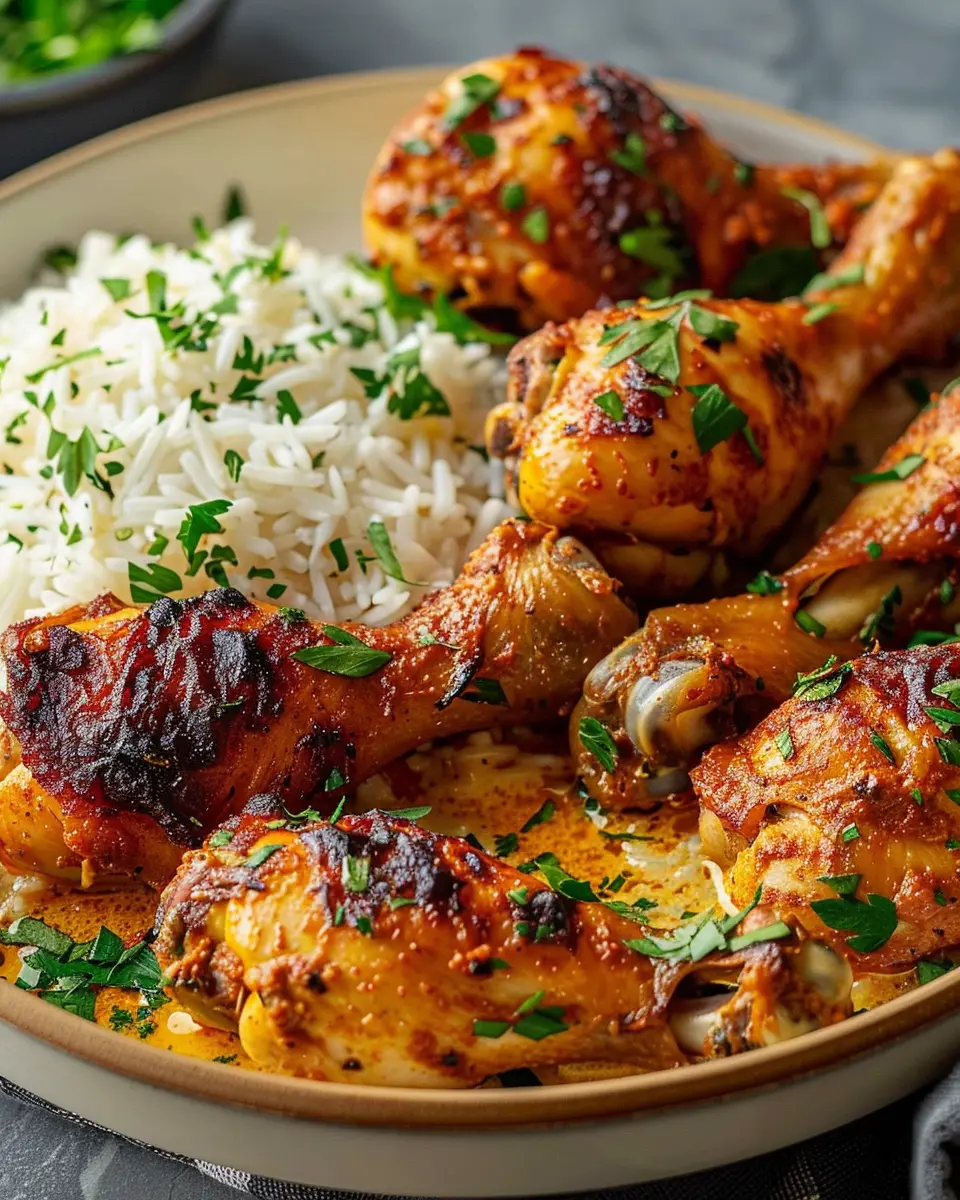 A creamy and indulgent dish featuring paprika-seasoned chicken drumsticks served with fluffy steamed rice.