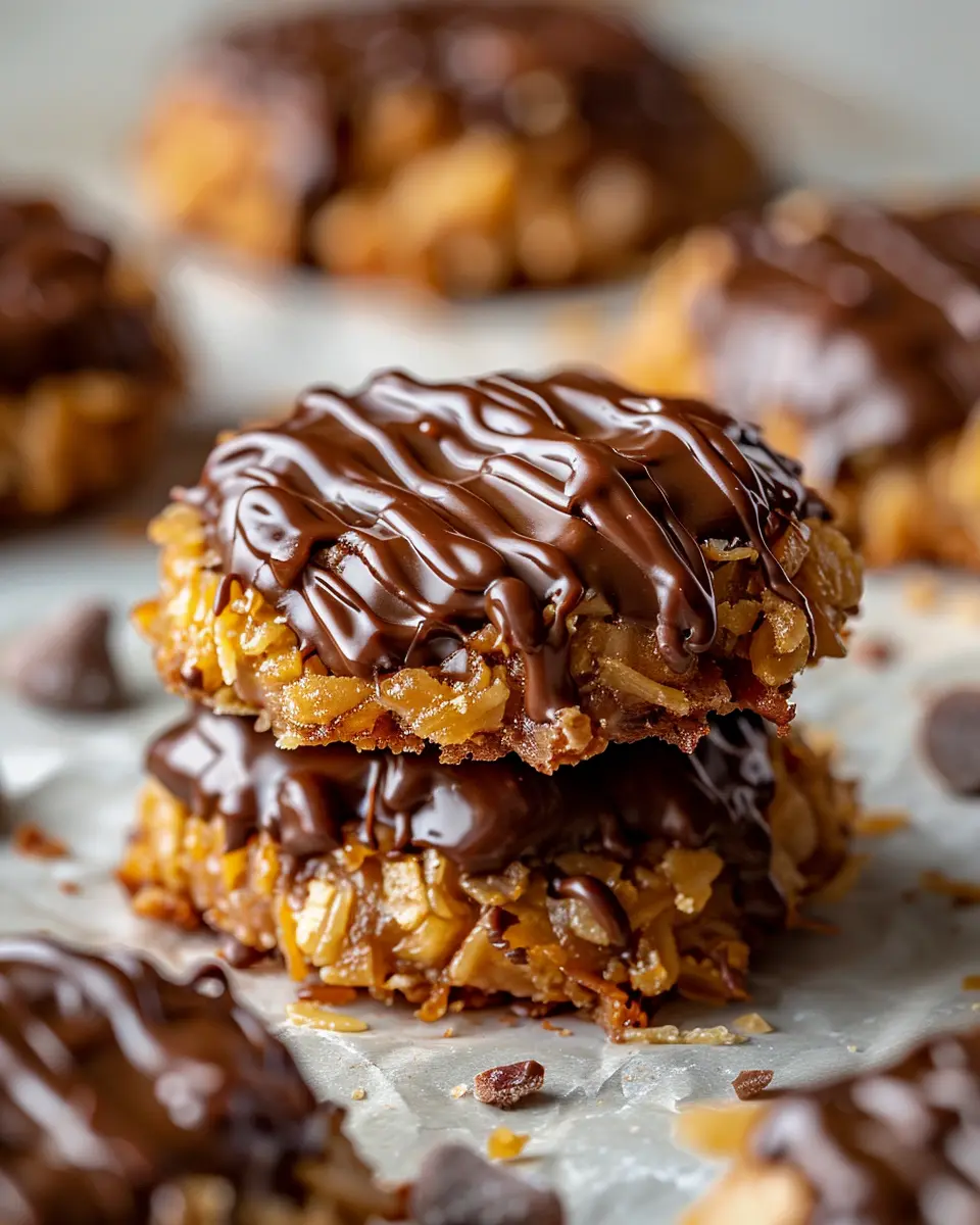 To make sure your no bake Samoa cookies hold their shape, it’s crucial to allow them adequate time to set. After mixing the ingredients, let the cookies chill in the refrigerator for at least 1–2 hours. The coconut and chocolate will firm up nicely during this time. If you’re using a silicone mat to shape them, lightly oil the surface to prevent sticking.