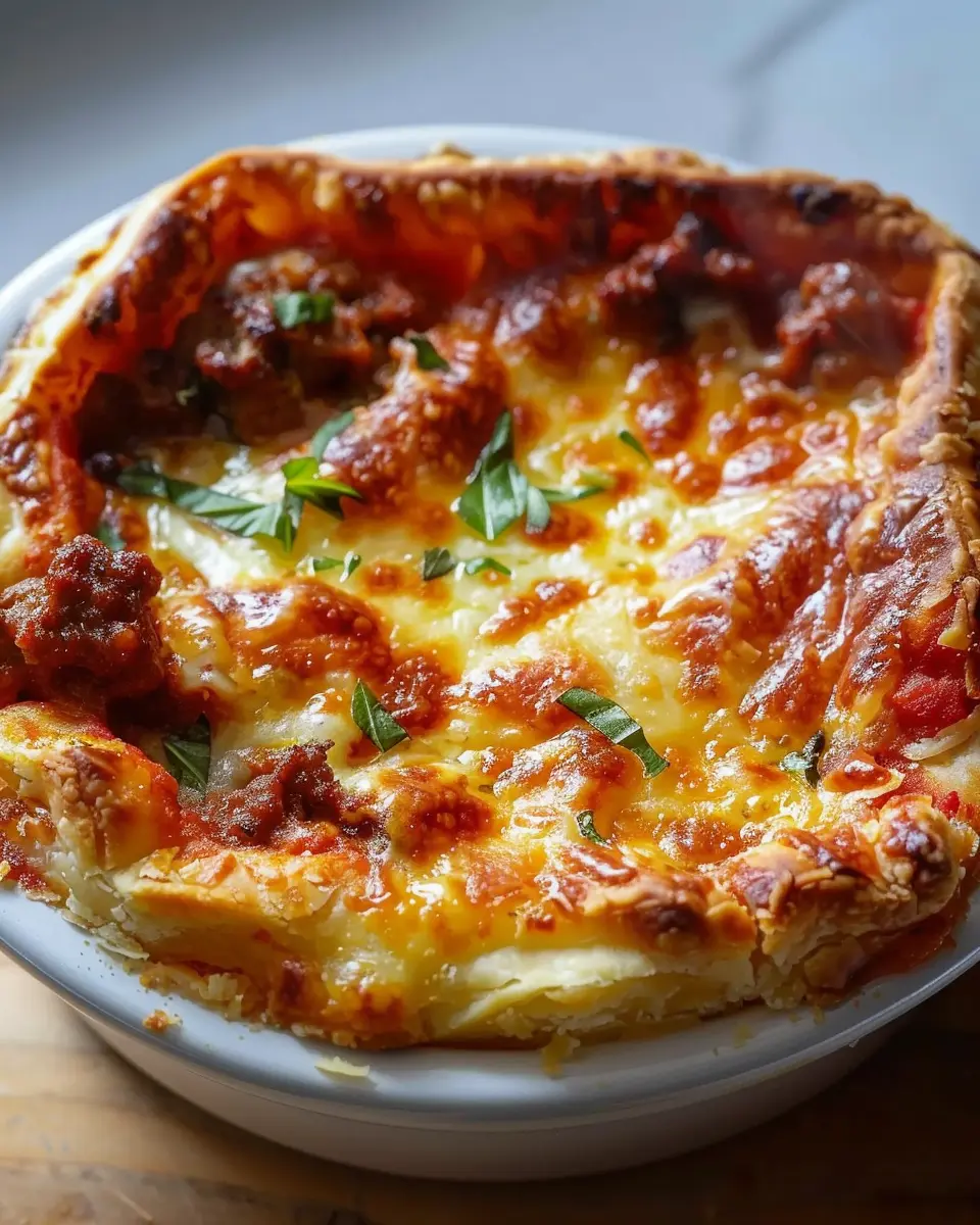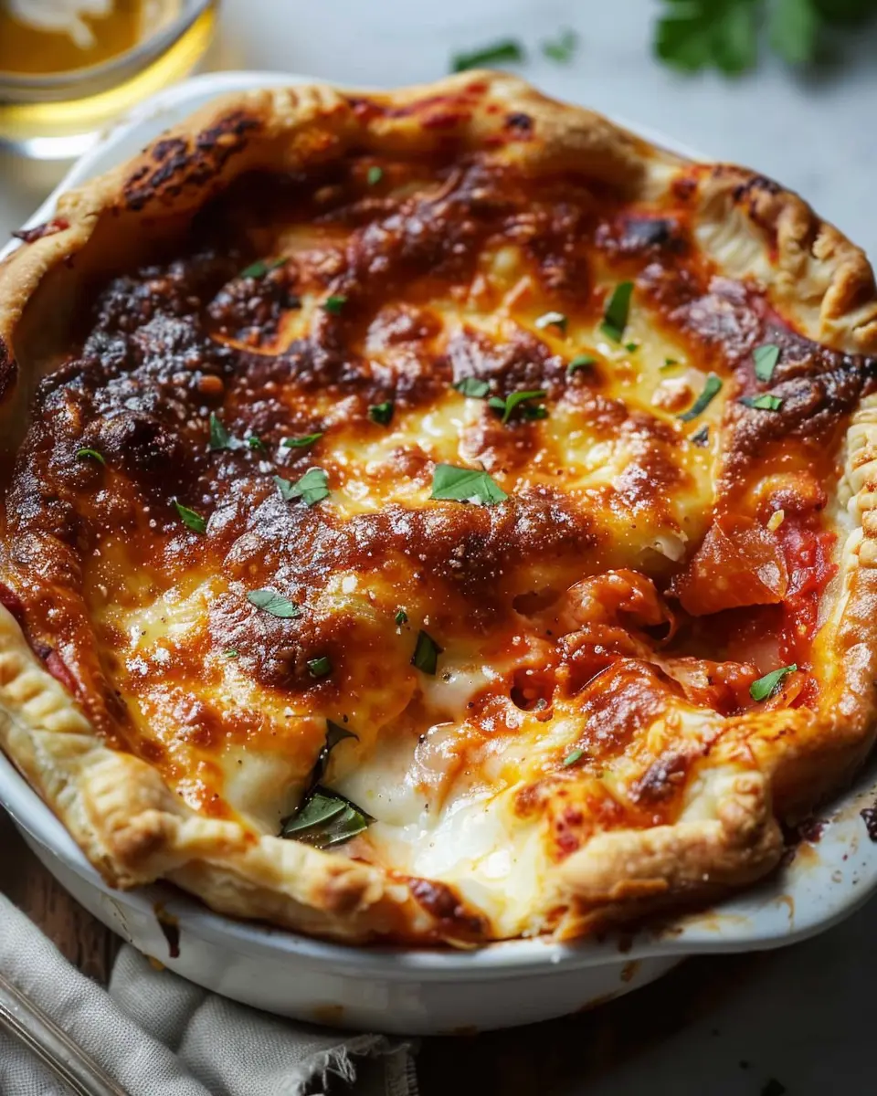 Enjoy the delightful fusion of pizza and pot pie in this comforting recipe that brings a new twist to your favorite Italian dish.
